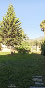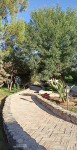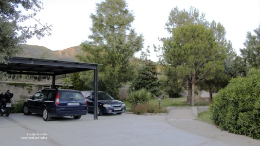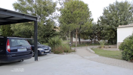 El aparcamiento cubierto está en la entrada de la finca y un camino empedrado, rodeado de árboles, jazmines y rosales, te lleva a la casa de alquiler.
