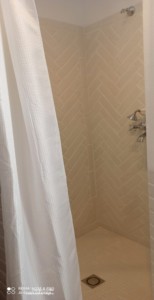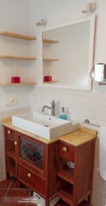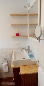 Este coqueto baño con ducha de obra sigue la línea de encanto y funcionalidad de toda la casa.